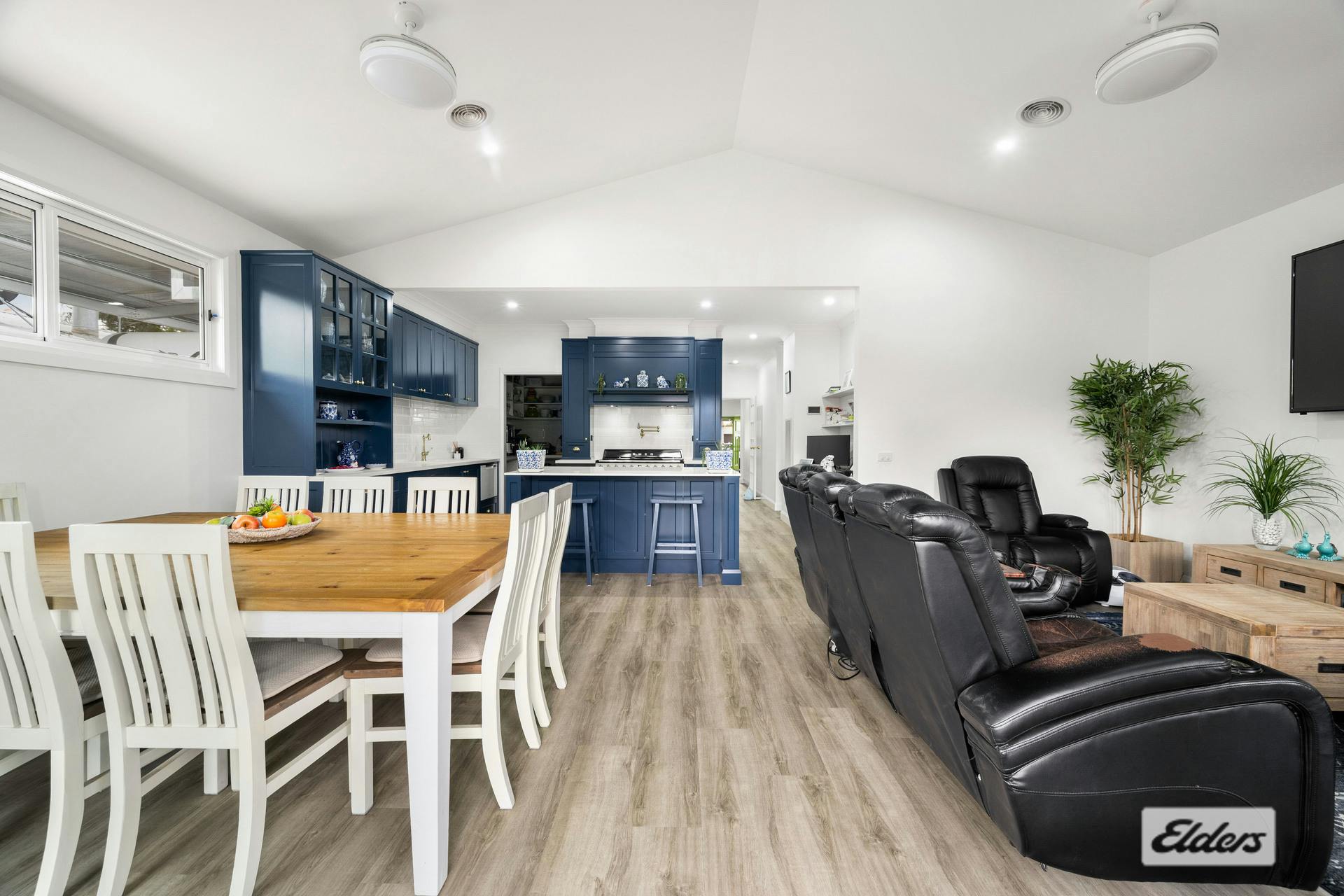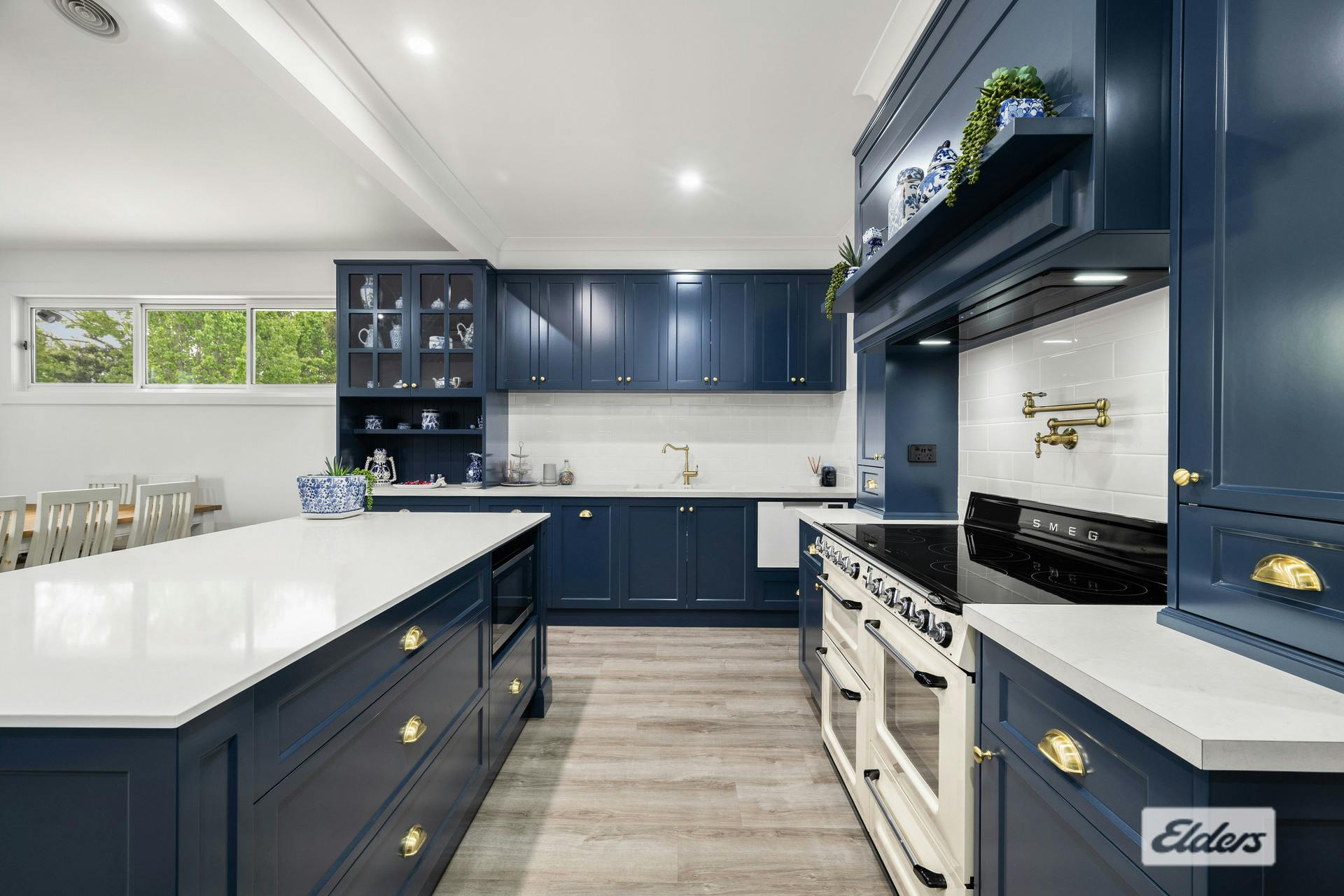 At the heart of the home is a classic Hampton's kitchen, finished with striking blue custom cabinetry and a statement 110cm Smeg freestanding induction oven with four doors, complemented by pot filler tapware, large walk-in pantry with fridge space, dishwasher and an impressive island bench. High-quality fixtures and fittings, along with an abundance of built-in storage, reflect the home's premium standard.